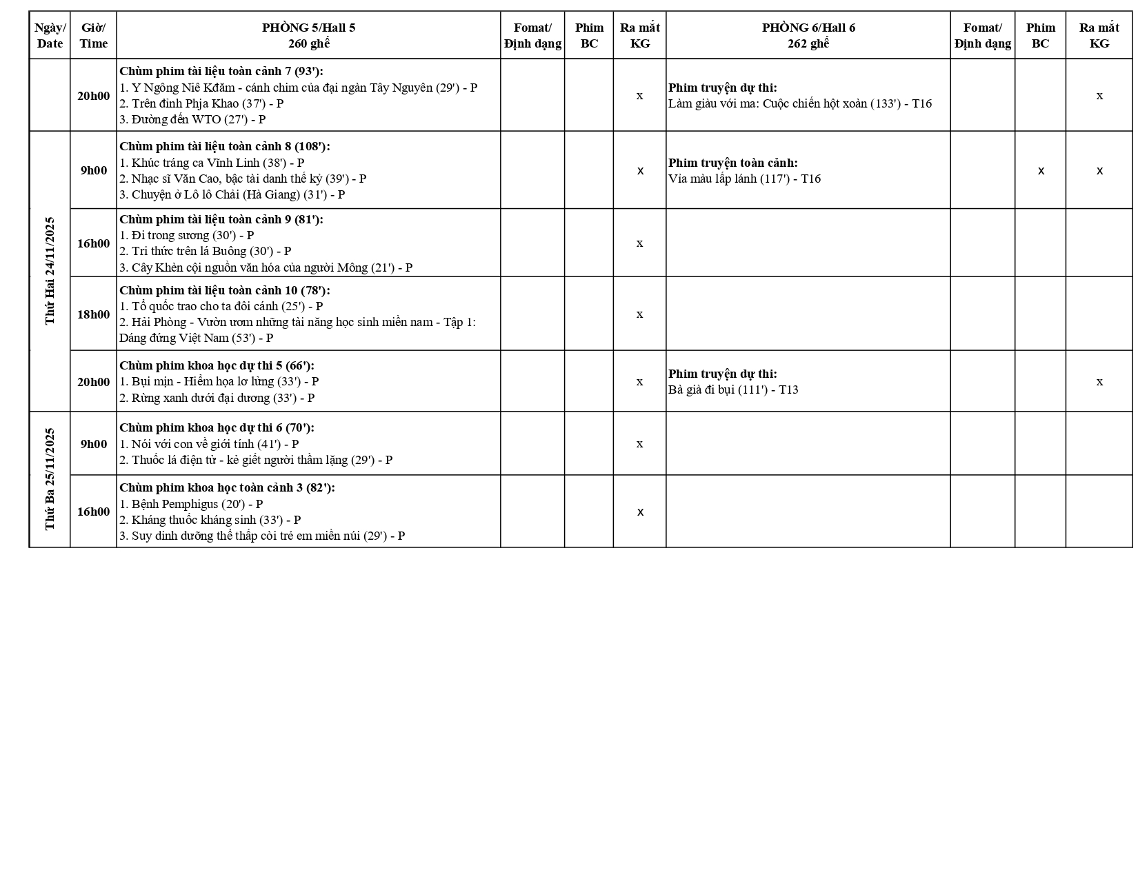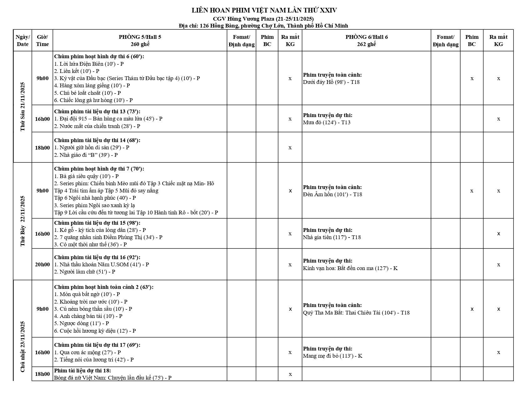 Lịch chiếu phim Liên hoan Phim Việt Nam lần thứ XXIV (CGV Hùng Vương Plaza) Bài viết cùng chủ đề Lịch chiếu phim Liên hoan Phim Việt Nam lần thứ XXIV (CINESTAR HAI BÀ TRƯNG) Lịch chiếu phim tại Liên hoan Phim Việt Nam lần thứ XXIV (Rạp Galaxy Parc Mall)